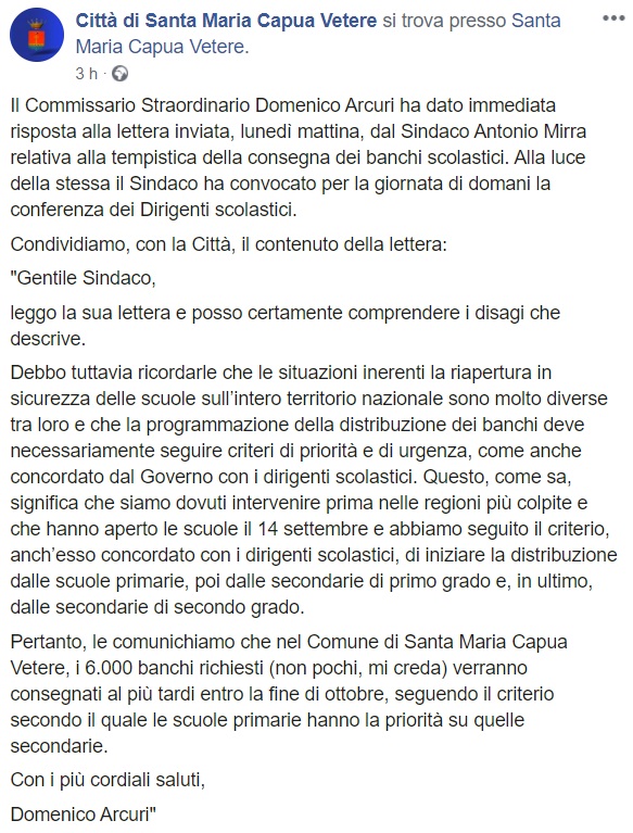 Questo quanto apprendiamo dalla pagina facebook del Comune di SMCV: