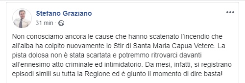 "Non conosciamo ancora le cause che hanno scatenato l’incendio che all’alba ha colpito nuovamente lo Stir di Santa Maria Capua Vetere. La pista dolosa non è stata scartata e potremmo ritrovarci davanti all’ennesimo atto criminale ed intimidatorio. Da mesi, infatti, si registrano episodi simili su tutta la Regione ed è giunto il momento di dire basta!"
