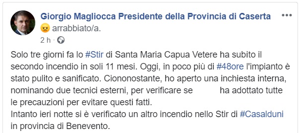 SMCV. Incendio allo Stir. Pres. Magliocca: "Impianto pulito e sanificato"