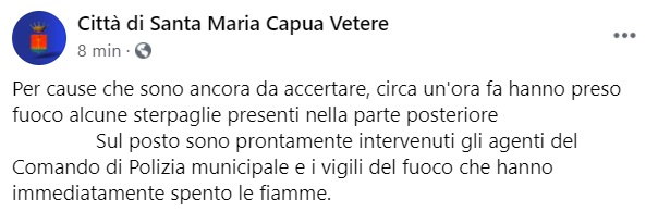"Per cause che sono ancora da accertare, circa un'ora fa hanno preso fuoco alcune sterpaglie presenti nella parte posteriore ... Sul posto- si legge nella nota- sono prontamente intervenuti gli agenti del Comando di Polizia municipale e i vigili del fuoco che hanno immediatamente spento le fiamme."
