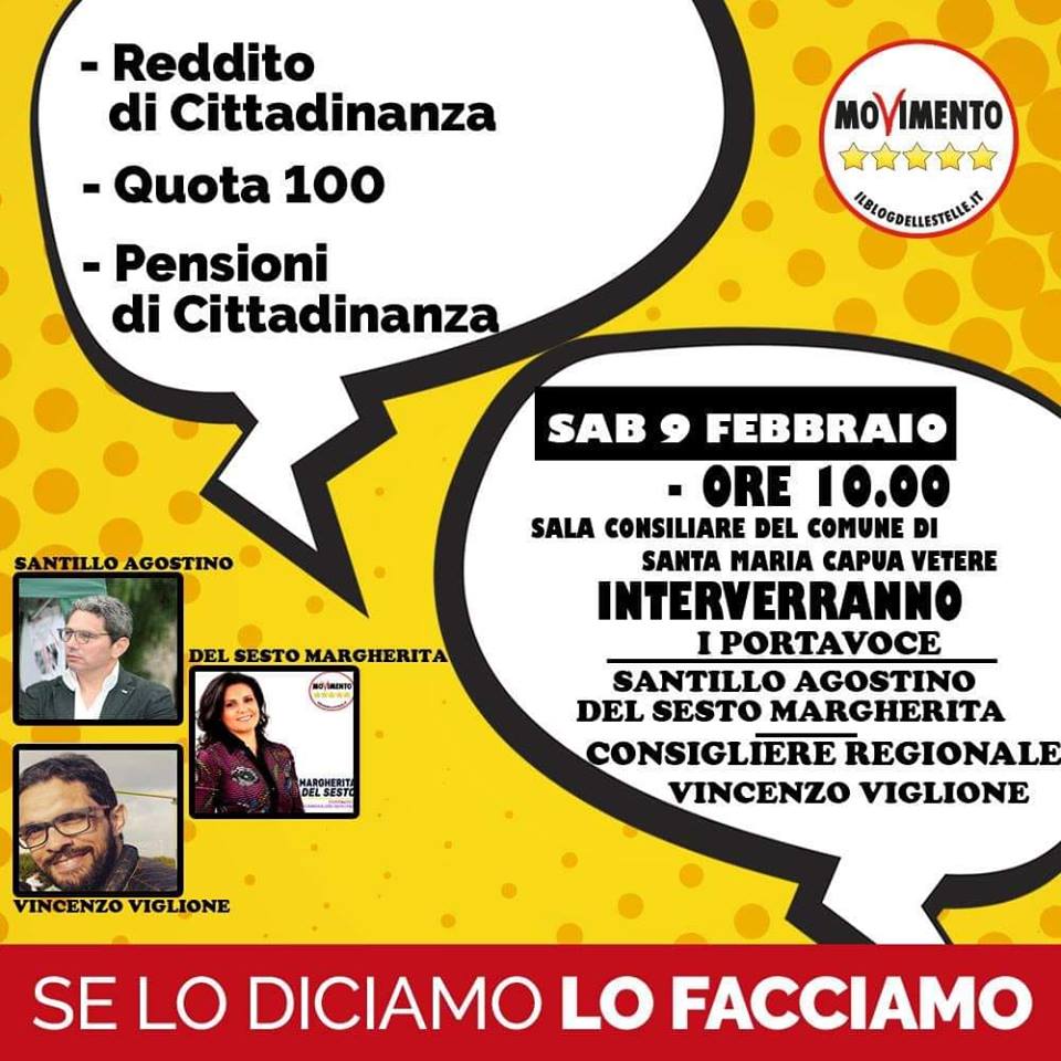Sabato 9 febbraio alle ore 10:00 si terrà un importante incontro pubblico sul reddito di cittadinanza, quota 100 e le pensioni di cittadinanza presso la Sala Consiliare del Comune di Santa Maria Capua Vetere, a Palazzo Lucarelli in via Albana. All'evento saranno presenti Angelo Alfano e Silvia Cauli, i portavoce locali, Agostino Santillo, portavoce al Senato, Margherita del Sesto, portavoce alla Camera e Vincenzo Viglione, portavoce alla Regione Campania.