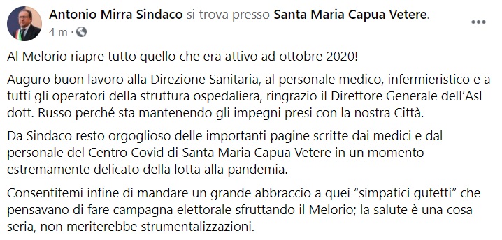 Questo quanto pubblicato sulla pagina fb del Sindaco Mirra: "Al Melorio riapre tutto quello che era attivo ad ottobre 2020! Auguro buon lavoro alla Direzione Sanitaria, al personale medico, infermieristico e a tutti gli operatori della struttura ospedaliera - si legge nella nota -, ringrazio il Direttore Generale dell’Asl dott. Russo perché sta mantenendo gli impegni presi con la nostra Città. Da Sindaco resto orgoglioso delle importanti pagine scritte dai medici e dal personale del Centro Covid di Santa Maria Capua Vetere in un momento estremamente delicato della lotta alla pandemia. Consentitemi infine di mandare un grande abbraccio a quei “simpatici gufetti” che pensavano di fare campagna elettorale sfruttando il Melorio - si legge nella nota -; la salute è una cosa seria, non meriterebbe strumentalizzazioni."