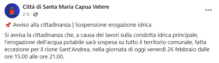 "Si avvisa la cittadinanza che, a causa dei lavori sulla condotta idrica principale, l'erogazione dell'acqua potabile sarà sospesa su tutto il territorio comunale, -si legge nella nota- fatta eccezione per il rione Sant'Andrea, nella giornata di oggi venerdì 26 febbraio dalle ore 15.00 alle ore 21.00."