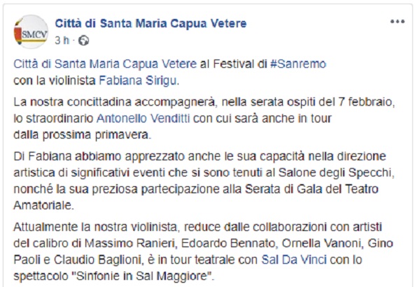 Questo il post pubblicato sulla pagina fb 'Città di Santa Maria Capua Vetere'