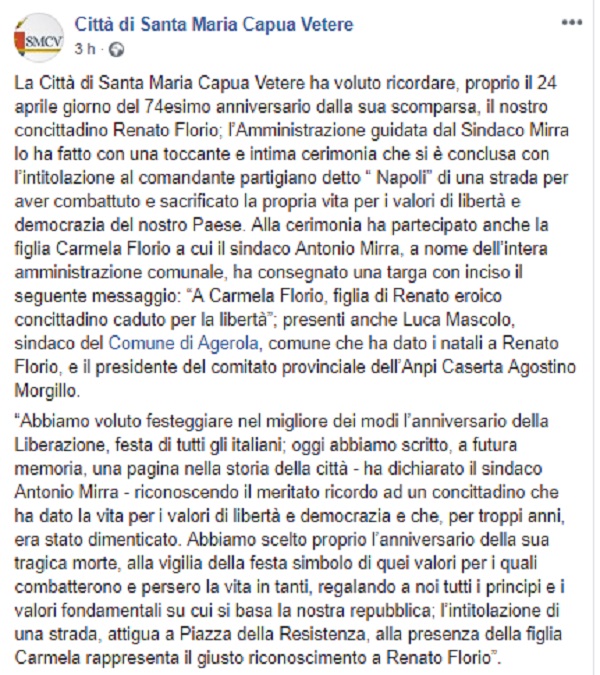 Questo il post pubblicato sulla pagina ufficiale della 'Città di Santa Maria Capua Vetere'