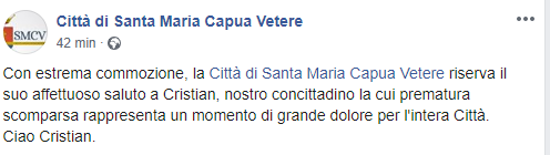 Questo il testo del post facebook del Comune di Santa Maria Capua Vetere, 'Città di Santa Maria Capua Vetere'. Noi ci uniamo ai rappresentanti del comune sammaritano e porgiamo le nostre condoglianze alla famiglia dell'ottimo ragazzo di un giovane casertano estremamente perbene. Ciao Cristian.