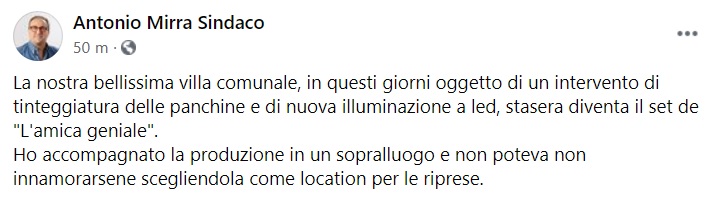 Questo quanto apprendiamo dalla pagina fb Antonio Mirra Sindaco: "La nostra bellissima villa comunale, in questi giorni oggetto di un intervento di tinteggiatura delle panchine e di nuova illuminazione a led, stasera - si legge nella nota - diventa il set de "L'amica geniale". Ho accompagnato la produzione in un sopralluogo e non poteva non innamorarsene scegliendola come location per le riprese."