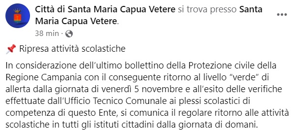 "Ripresa attività scolastiche. In considerazione dell’ultimo bollettino della Protezione civile della Regione Campania con il conseguente ritorno al livello “verde” di allerta dalla giornata di venerdì 5 novembre e all’esito delle verifiche effettuate dall’Ufficio Tecnico Comunale ai plessi scolastici di competenza di questo Ente, si comunica- si legge nella nota- il regolare ritorno alle attività scolastiche in tutti gli istituti cittadini dalla giornata di domani."