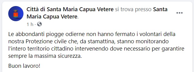 Questo quanto apprendiamo dalla pagina fb Città di SMCV: "Le abbondanti piogge odierne non hanno fermato i volontari della nostra Protezione civile che, da stamattina - si legge nella nota -, stanno monitorando l'intero territorio cittadino intervenendo dove necessario per garantire sempre la massima sicurezza. Buon lavoro!"
