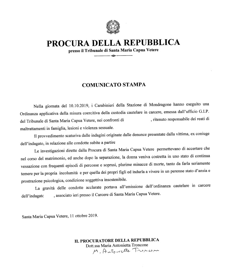 Questa la nota dell'uffico stampa della Procura di Santa Maria Capua Vetere:
