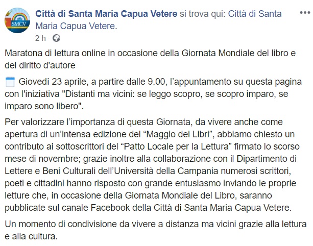Questo quanto apprendiamo dalla pagina facebook del Comune di SMCV: