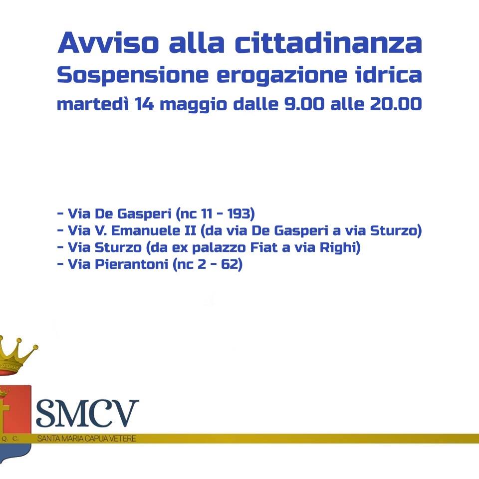 "Avviso alla cittadinanza | Si comunica che, a causa di lavori sulla condotta idrica principale, l’erogazione dell’acqua potabile verrà sospesa, nelle seguenti strade, martedì 14 maggio dalle ore 9.00 alle ore 20.00."
