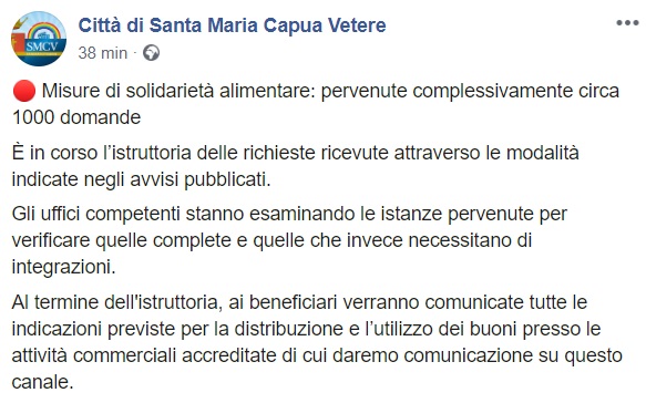 Questo quanto apprendiamo dalla pagina facebook del Comune di SMCV: