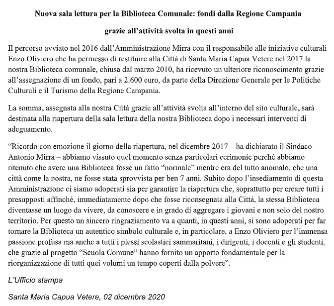 Pubblichiamo nota stampa del Comune di SMCV