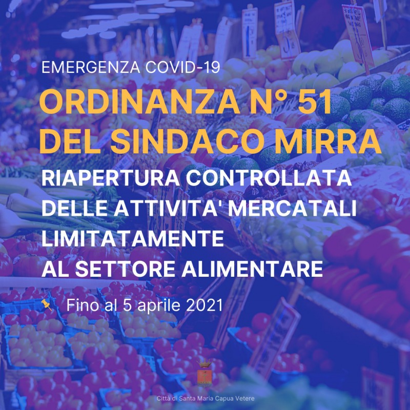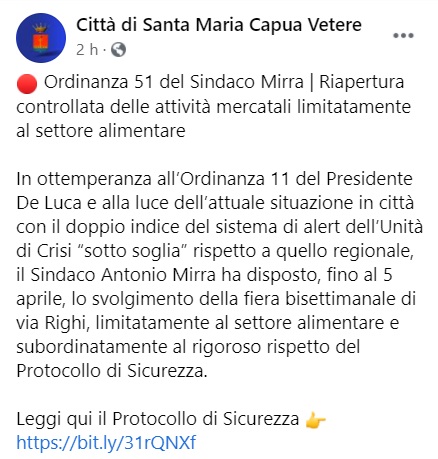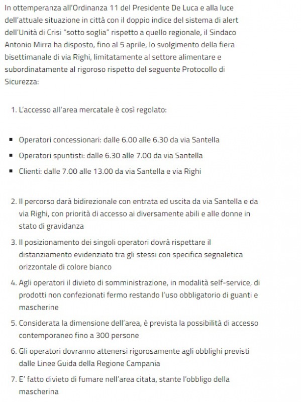 "Ordinanza 51 del Sindaco Mirra. Riapertura controllata delle attività mercatali limitatamente al settore alimentare. -Si legge nella nota- In ottemperanza all’Ordinanza 11 del Presidente De Luca e alla luce dell’attuale situazione in città con il doppio indice del sistema di alert dell’Unità di Crisi “sotto soglia” rispetto a quello regionale, il Sindaco Antonio Mirra ha disposto, fino al 5 aprile, -si legge nella nota- lo svolgimento della fiera bisettimanale di via Righi, limitatamente al settore alimentare e subordinatamente al rigoroso rispetto del Protocollo di Sicurezza. Leggi qui il Protocollo di Sicurezza https://bit.ly/31rQNXf"