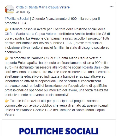 Questo quanto apprendiamo dal profilo Fb del Comune di SMCV