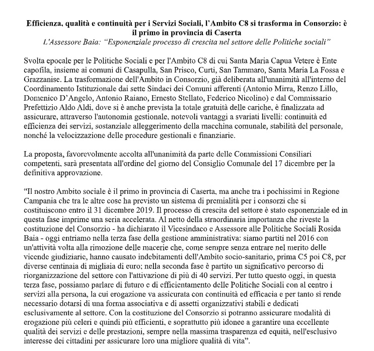 Questa la nota stampa del Comune di Santa Maria Capua Vetere: