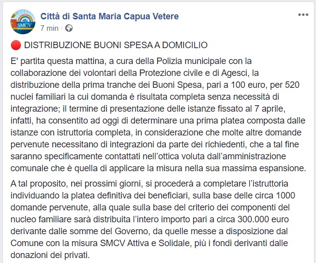 Questo quanto pubblicato sulla pagina FB del Comune di SMCV