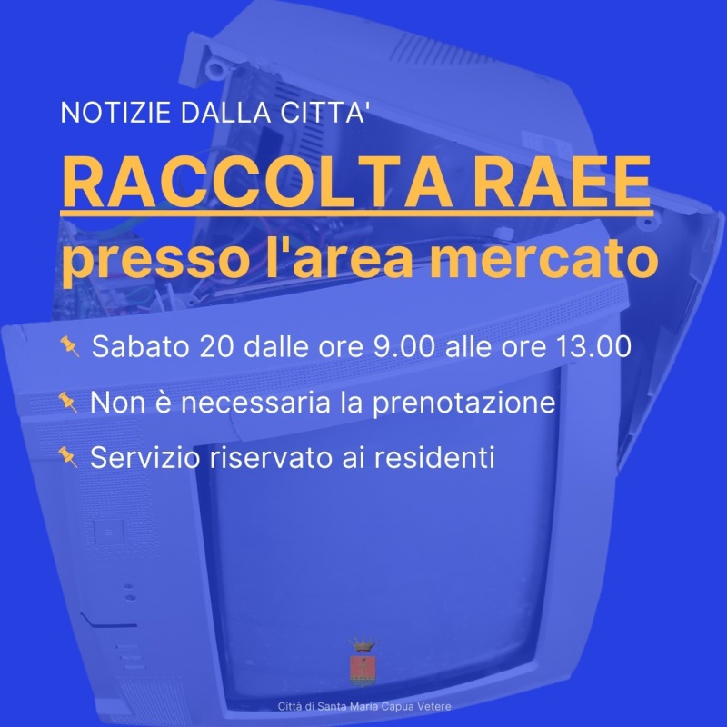 Pubblichiamo nota dell'Ufficio stampa del Comune di Santa Maria Capua Vetere: "Raccolta RAEE Sabato 20 febbraio dalle 9.00 alle 13.00 presso l’area mercato Considerato l’ottimo riscontro in termini di affluenza di cittadini e di quantitativi di rifiuti conferiti - si legge nella nota -, l’Amministrazione comunale con l’assessore delegato Francesco Petrella ha ritenuto opportuno rinnovare l’appuntamento con la stazione mobile per la raccolta straordinaria di RAEE. - Area mercato: ingresso da via Santella, uscita da via Righi - E’ possibile conferire RAEE di piccole dimensioni (elettrodomestici, elettronica di consumo, apparecchi di illuminazione, cellulari, ferri da stiro - si legge nella nota -, stufe elettriche, televisori etc). - Non è necessaria la prenotazione - Il servizio è riservato ai residenti nel Comune di Santa Maria Capua Vetere"