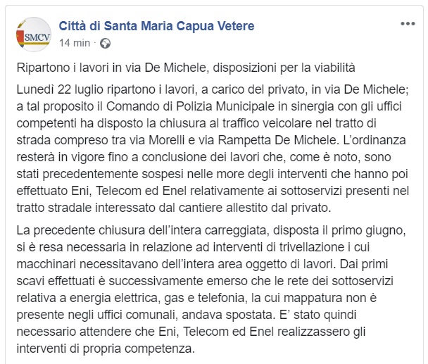 Questo quanto apprendiamo dalla pagina FB del Comune di SMCV
