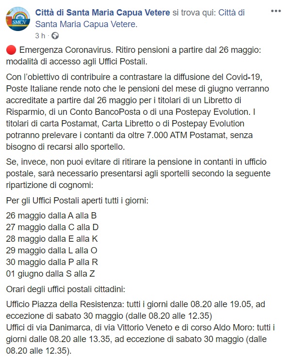 Questo quanto pubblicato sulla pagina facebook del Comune di SMCV:
