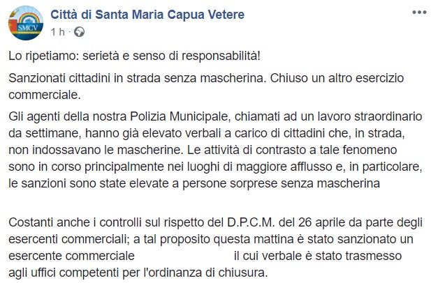 Questo quanto apprendiamo dalla pagina facebook del Comune di SMCV: