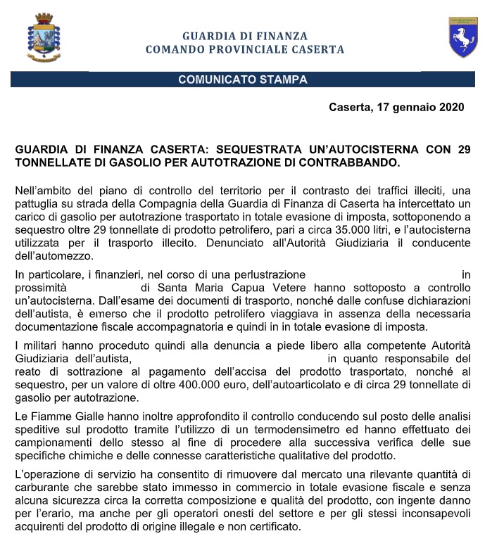Pubblichiamo nota stampa del Comando Provinciale Guardia di Finanza Caserta: