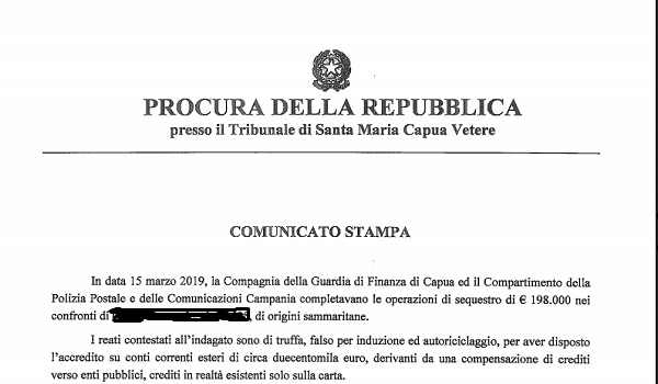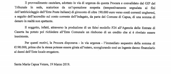 Questo parte del comunicato inviatoci dalla Procura della Repubblica presso il Tribunale di Santa Maria Capua Vetere.