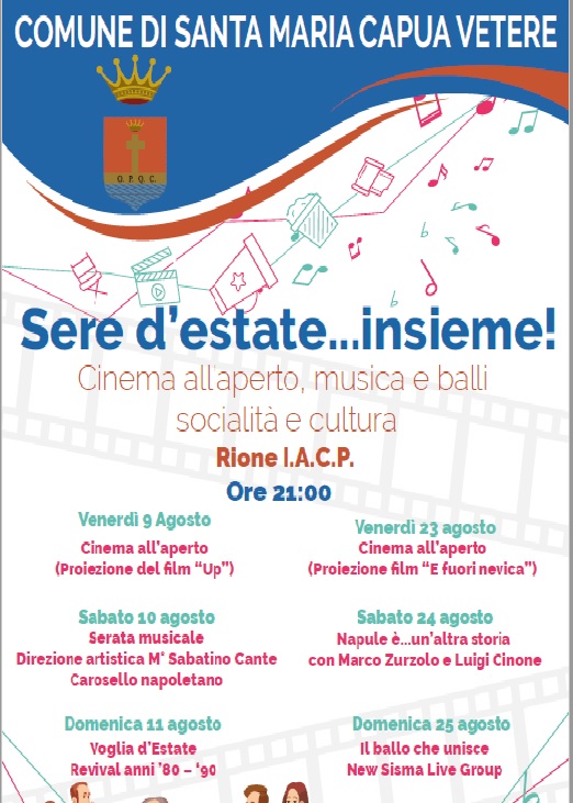 "Nell’ambito dei servizi territoriali per anziani, il Comune di Santa Maria Capua Vetere – capofila dell’Ambito C8 – ha programmato una serie di eventi rivolti agli anziani e alle loro famiglie dedicati alla socializzazione e alla cultura con particolare riferimento a quel periodo estivo in cui molti anziani, soprattutto quelli che vivono in condizioni di fragilità economiche e sociali, vivono una sorta di confinamento domestico e talvolta anche in solitudine. Si legge nel comunicato. A tal fine l’amministrazione comunale guidata dal sindaco Antonio Mirra ha inteso allestire, quale idea ampiamente condivisa, un cartellone di sei eventi e di attività culturali per altrettanti momenti di aggregazione attraverso la musica, il cinema e il ballo con l’obiettivo di aumentare il livello di partecipazione della comunità e il miglioramento della qualità della vita della persona anziana. Si legge nel comunicato. Il progetto, che per il primo anno verrà realizzato nel Rione IACP quale luogo ritenuto più utile per incentivare nuovi approcci alla socialità prevede sei eventi in due weekend.