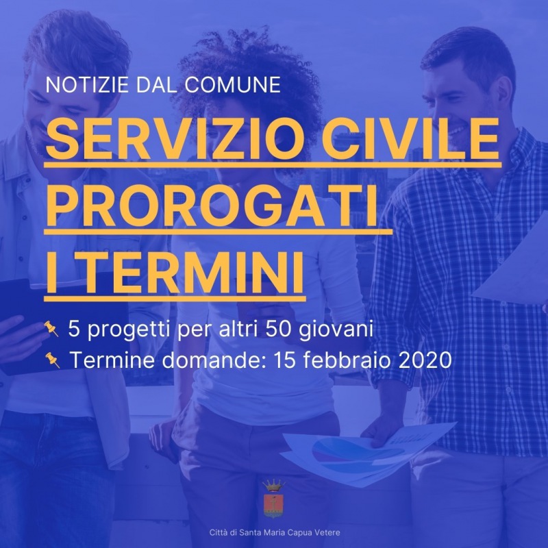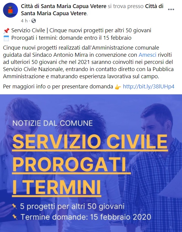 "Servizio Civile | Cinque nuovi progetti per altri 50 giovani. Prorogati i termini: domande entro il 15 febbraio. Cinque nuovi progetti realizzati dall’Amministrazione comunale guidata dal Sindaco Antonio Mirra in convenzione- si legge nella nota- con Amesci rivolti ad ulteriori 50 giovani che nel 2021 saranno coinvolti nei percorsi del Servizio Civile Nazionale, entrando in contatto diretto con la Pubblica Amministrazione e maturando esperienza lavorativa sul campo. Per maggiori info o per presentare domanda: http://bit.ly/38lUHp4"