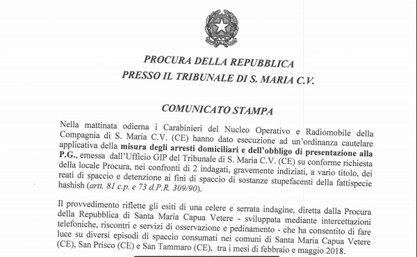 Questo il comunicato inviatoci dalla Procura della Repubblica presso il Tribunale di Santa Maria Capua Vetere.