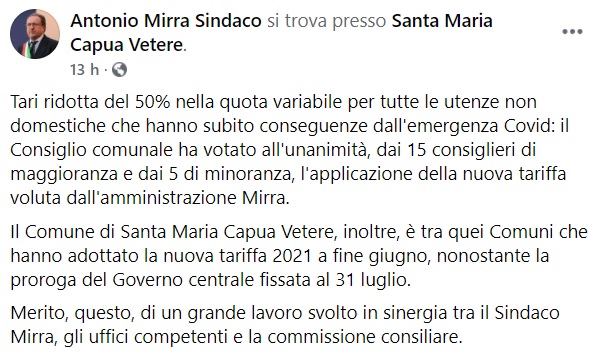 "Tari ridotta del 50% nella quota variabile per tutte le utenze non domestiche che hanno subito conseguenze dall'emergenza Covid: il Consiglio comunale ha votato all'unanimità, dai 15 consiglieri di maggioranza e- si legge nella nota- dai 5 di minoranza, l'applicazione della nuova tariffa voluta dall'amministrazione Mirra. Il Comune di Santa Maria Capua Vetere, inoltre, è tra quei Comuni che hanno adottato la nuova tariffa 2021 a fine giugno, nonostante la proroga del Governo centrale fissata al 31 luglio. Merito, questo, di un grande lavoro svolto- si legge nella nota- in sinergia tra il Sindaco Mirra, gli uffici competenti e la commissione consiliare."