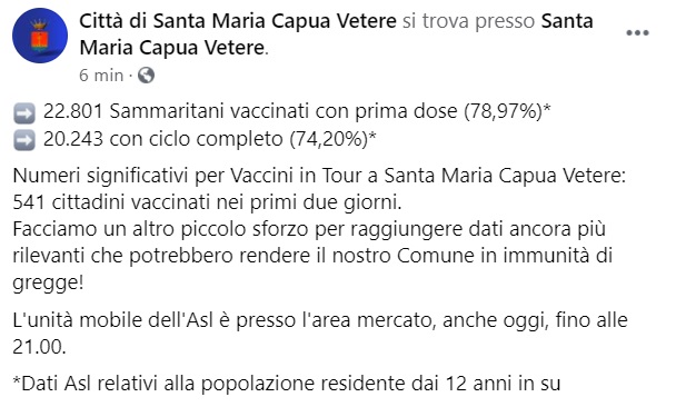 Questo quanto apprendiamo dalla pagina fb del Comune di SMCV: "22.801 Sammaritani vaccinati con prima dose (78,97%)* 20.243 con ciclo completo (74,20%)* Numeri significativi per Vaccini in Tour a Santa Maria Capua Vetere: 541 cittadini vaccinati nei primi due giorni - si legge nella nota -. Facciamo un altro piccolo sforzo per raggiungere dati ancora più rilevanti che potrebbero rendere il nostro Comune in immunità di gregge! L'unità mobile dell'Asl è presso l'area mercato, anche oggi, fino alle 21.00. *Dati Asl relativi alla popolazione residente dai 12 anni in su".