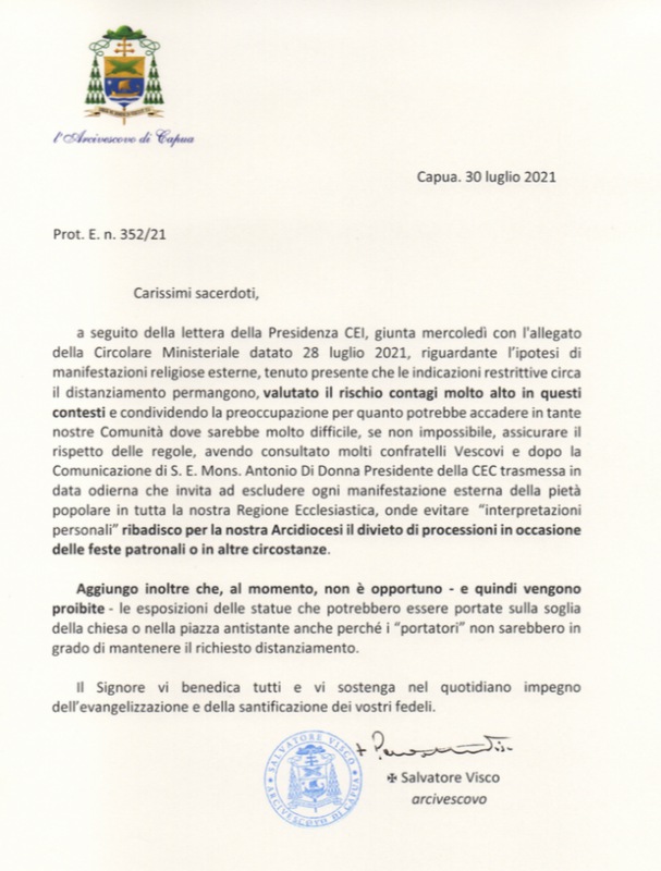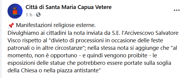 Questo il post pubblicato sulla pagina Facebook della Città di Santa Maria Capua Vetere: "Manifestazioni religiose esterne. Divulghiamo ai cittadini la nota inviata da S.E. l'Arcivescovo Salvatore Visco rispetto al "divieto di processioni in occasione delle feste patronali o in altre circostanze"; nella stessa nota - si legge nel post - si aggiunge che "al momento, non è opportuno - e quindi vengono proibite - le esposizioni delle statue che potrebbero essere portate sulla soglia della Chiesa o nella piazza antistante".