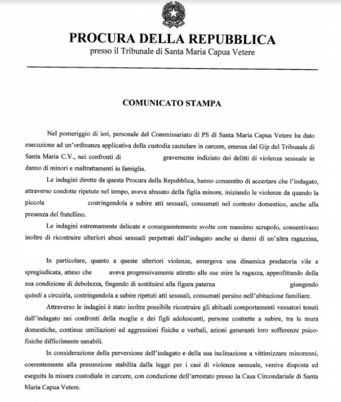 Questa parte della nota stampa della Procura della Repubblica presso il Tribunale di SMCV: