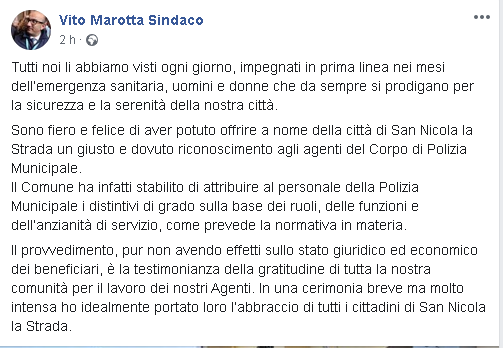"Tutti noi li abbiamo visti ogni giorno, impegnati in prima linea nei mesi dell’emergenza sanitaria, uomini e donne che da sempre si prodigano per la sicurezza e la serenità della nostra città. Sono fiero e felice di aver potuto offrire a nome della città di San Nicola la Strada un giusto e dovuto riconoscimento agli agenti del Corpo di Polizia Municipale. Il Comune ha infatti stabilito di attribuire al personale della Polizia Municipale i distintivi di grado sulla base dei ruoli, delle funzioni e dell’anzianità di servizio, come prevede la normativa in materia. Il provvedimento, pur non avendo effetti sullo stato giuridico ed economico dei beneficiari, è la testimonianza della gratitudine di tutta la nostra comunità per il lavoro dei nostri Agenti. In una cerimonia breve ma molto intensa ho idealmente portato loro l’abbraccio di tutti i cittadini di San Nicola la Strada."
