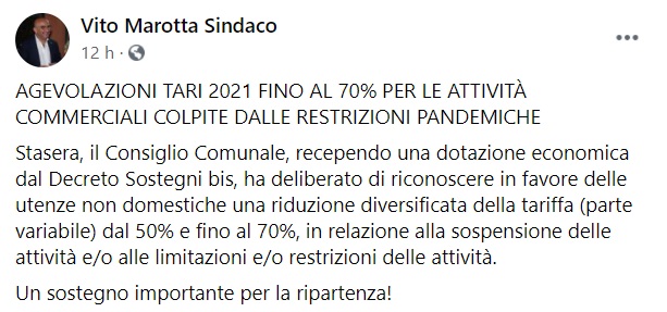 "AGEVOLAZIONI TARI 2021 FINO AL 70% PER LE ATTIVITÀ COMMERCIALI COLPITE DALLE RESTRIZIONI PANDEMICHE. Stasera, il Consiglio Comunale, recependo una dotazione economica dal Decreto Sostegni bis, ha deliberato- si legge nella nota- di riconoscere in favore delle utenze non domestiche una riduzione diversificata della tariffa (parte variabile) dal 50% e fino al 70%, in relazione alla sospensione delle attività e/o alle limitazioni e/o restrizioni delle attività. Un sostegno importante per la ripartenza!"