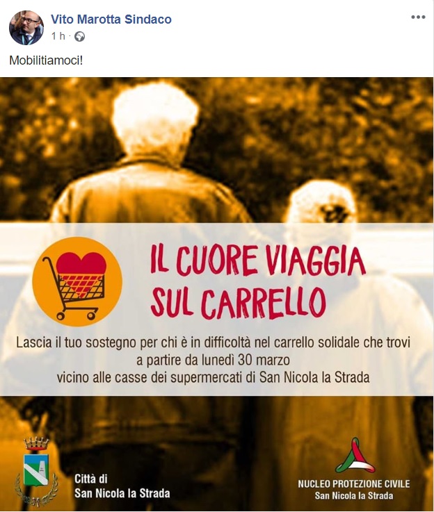 "L’Amministrazione Comunale di San Nicola la Strada, su input dell’Assessore alle Politiche Sociali Lucio Bernardo in collaborazione con il nucleo comunale di Protezione Civile e le comunità parrocchiali di Santa Maria degli Angeli e Maria Santissima della Pietà, lancia un appello alla cittadinanza per aiutare coloro che sono in difficoltà economiche a causa dell’emergenza Coronavirus. -Si legge nella nota- Da lunedì 30 marzo 2020, presso i supermercati della Città sarà possibile acquistare prodotti per il “carrello solidale”. Nei pressi delle casse di ogni supermercato ci sarà un carrello o una postazione dove ognuno potrà lasciare i prodotti che intende offrire. Servono beni di prima necessità ovvero pasta, latte a lunga conservazione, farina, biscotti, olio, zucchero, caffè, pomodori, sugo e altri prodotti in scatola come i legumi. -Si legge nella nota- Per maggiori informazioni telefonare agli uffici della Protezione Civile siti in via Paul Harris, oppure chiamare il numero di telefono 0823452242. Dopo le adesioni degli esercizi commerciali, sarà diramato l’elenco completo dei supermercati che hanno aderito all’iniziativa."