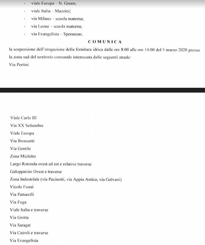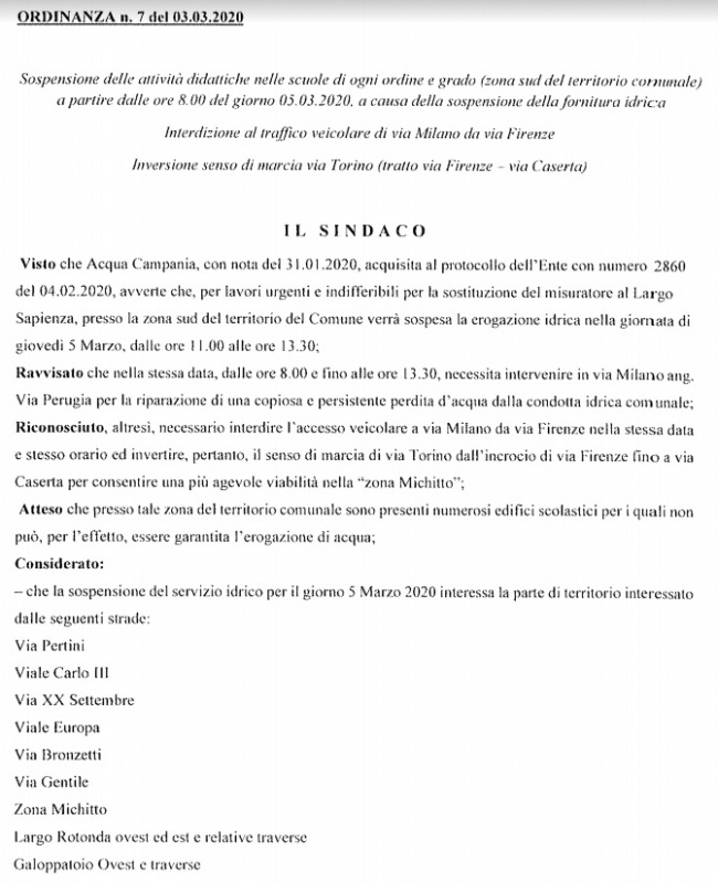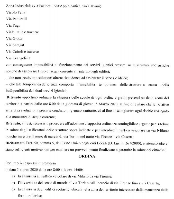 Questa l'ordinanza del Sindaco Vito Marotta per la sospensione delle attività didattiche il giorno 5 marzo 2020