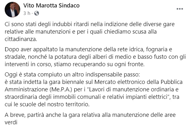 Questo quanto pubblicato sulla pagina fb del Sindaco Marotta: "Ci sono stati degli indubbi ritardi nella indizione delle diverse gare relative alle manutenzioni e per i quali chiediamo scusa alla cittadinanza. Dopo aver appaltato la manutenzione della rete idrica, fognaria e stradale, nonché la potatura degli alberi di medio e basso fusto con gli interventi in corso, stiamo recuperando su ogni fronte. Oggi è stata compiuto un altro indispensabile passo: è stata indetta la gara biennale sul Mercato elettronico della Pubblica Amministrazione (Me.P.A.) per i “Lavori di manutenzione ordinaria e straordinaria degli immobili comunali e relativi impianti elettrici”, tra cui le scuole del nostro territorio. A breve, partirà anche la gara relativa alla manutenzione delle aree verdi"