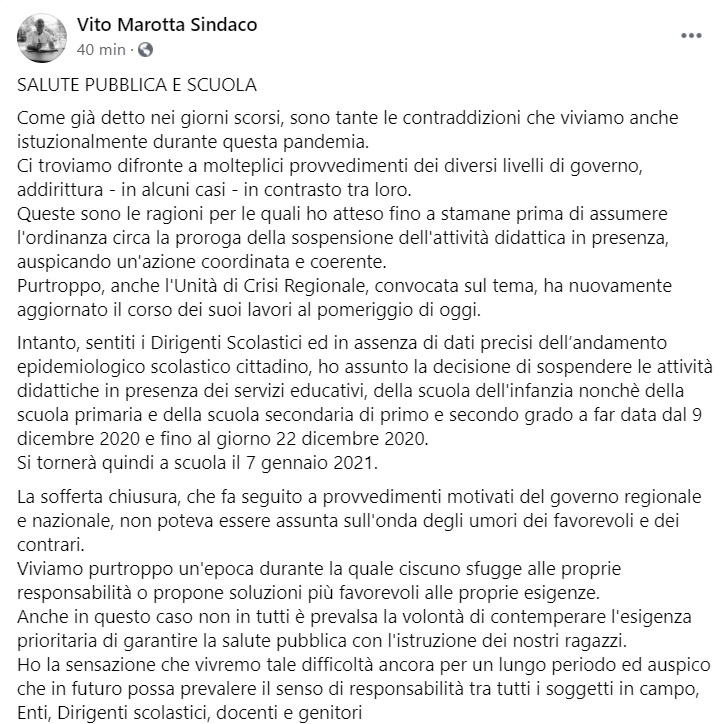 Questo quanto pubblicato sulla pagina facebook del Sindaco Marotta: