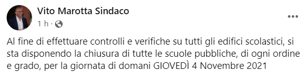 "Al fine di effettuare controlli e verifiche su tutti gli edifici scolastici, si sta disponendo la chiusura- si legge nella nota- di tutte le scuole pubbliche, di ogni ordine e grado, per la giornata di domani GIOVEDÌ 4 Novembre 2021"