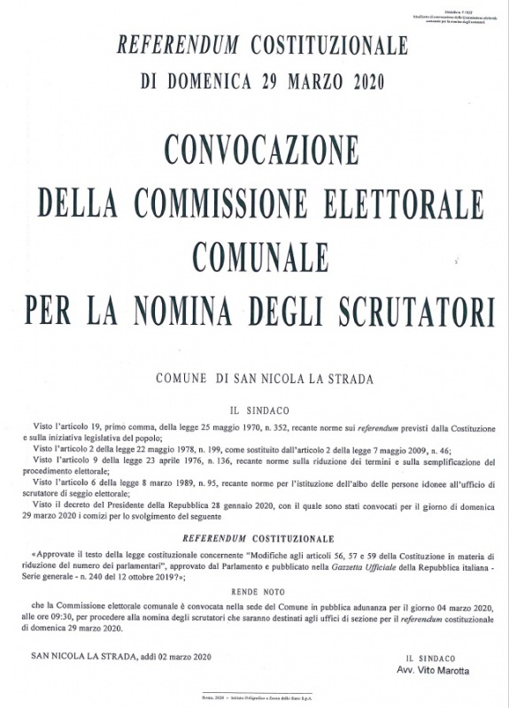 Mercoledì 4 Marzo alle ore 9.30 presso l'Aula Consiliare sita nella Casa Comunale sede Piazza Municipio 1, si effettuerà il SORTEGGIO per la nomina degli scrutatori! Se hai poca fiducia nelle Istituzioni o semplicemente vuoi denigrare il lavoro di chi svolge il tutto nel pieno della legalità, non restare a lamentarti o a pubblicare frasi contro l' Amministrazione restando dietro alla tastiera del tuo PC o del tuo smartphone, anzi.. abbi il coraggio di ricrederti, vieni al Comune e assisti alla seduta."
