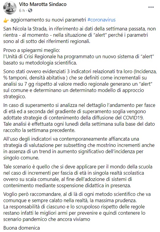 "aggiornamento su nuovi parametri #coronavirus. San Nicola la Strada, in riferimento ai dati della settimana passata, non rientra - al momento - nella situazione di “alert” perché i parametri sono al di sotto dei riferimenti regionali. Provo a spiegarmi meglio: l’Unità di Crisi Regionale ha programmato- si legge nella nota- un nuovo sistema di “alert” basato su metodologia scientifica. Sono stati ovvero evidenziati 3 indicatori relazionati tra loro (Incidenza, % tamponi, densità abitativa ) che se definiti come incrementali su analisi su 7 gg rispetto al valore medio regionale generano un “alert” sul comune e determinano un determinato modello di approccio strategico. In caso di superamento si analizza nel dettaglio l’andamento per fasce di età ed a seconda del gradiente di superamento soglia vengono adottate strategie di contenimento della diffusione del COVID19. Tale analisi è effettuata ogni lunedì della settimana sulla base del dato raccolto la settimana precedente. All’uso degli indicatori- si legge nella nota- va contemporaneamente affiancata una strategia di valutazione per subsetting che mostrino incrementi anche in assenza di un trend in aumento significativo dell’incidenza per singolo comune. Tale scenario è quello che si deve applicare per il mondo della scuola nel caso di incrementi per fascia di età in singola realtà scolastica ovvero su scala comunale, al fine dell’adozione di sistemi di contenimento mediante sospensione didattica in presenza. Voglio però raccomandare, al di là di ogni metodo scientifico che va comunque e sempre calato nella realtà, la massima prudenza. La responsabilità di ciascuno e lo scrupoloso rispetto delle regole restano infatti- si legge nella nota- le migliori armi per prevenire e quindi contenere lo scenario pandemico che ancora viviamo. Buona domenica"