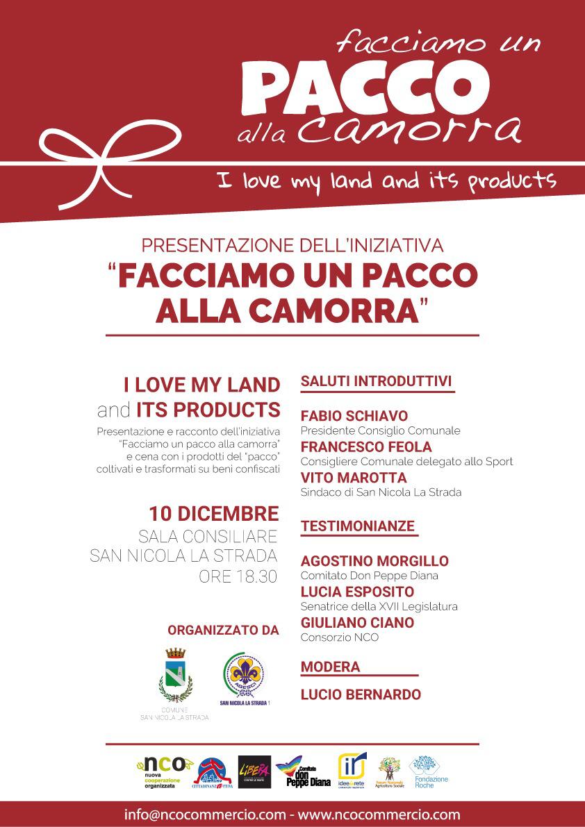 Quest'oggi, a San Nicola La Strada, presso la Sala Consiliare, si terrà la presentazione dell'iniziativa "Facciamo un pacco alla camorra". Seguiranno, ai saluti introduttivi, del Sindaco Vito Marotta, del Presidente del Consiglio Comunale, Fabio Schiavo, e del Consigliere Comunale delegato allo Sport, Francesco Feola, gli interventi di Agostino Morgillo, facente parte del Comitato Don Peppe Diana, Lucia Esposito, Senatrice della XVII Legislatura e Giuliano Ciano del Consorzio NCO. Il Moderatore dell'evento, sarà l'Assessore Lucio Bernardo.