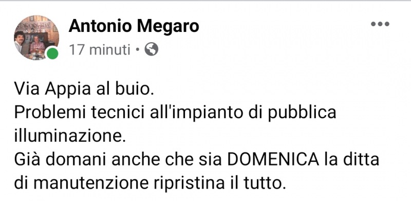 "Via Appia al buio. Problemi tecnici all'impianto di pubblica illuminazione. Già domani anche che sia DOMENICA la ditta di manutenzione ripristina il tutto."