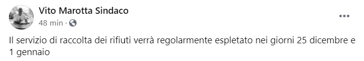 Questo quanto pubblicato sulla pagina facebook del Sindaco Marotta: