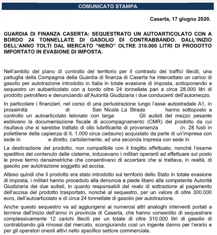 Pubblichiamo nota stampa del Comando Provinciale Guardia di Finanza Caserta