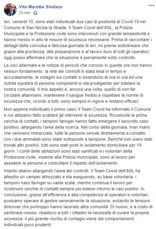 Questo quanto pubblicato sulla pagina facebook del Sindaco Marotta: