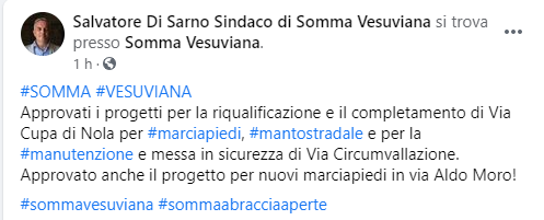 Questo il post pubblicato sulla sua pagina Facebook dal Sindaco di Somma Vesuviana Salvatore Di Sarno: "Approvati i progetti per la riqualificazione e il completamento di Via Cupa di Nola - si legge nel post - per marciapiedi, manto stradale e per la manutenzione e messa in sicurezza di Via Circumvallazione. Approvato anche il progetto - conclude il post - per nuovi marciapiedi in via Aldo Moro!".
